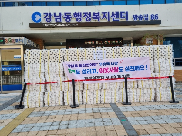 춘천시에는 강남동이 있습니다. 강남동의 통장님들은 22년 7월부터 매주 2차례 지역 카페들에 방문하여 우유팩을 수거하는 봉사를 진행합니다. 그동안 되살린 우유팩 8만개는 5천개의 재생화장지로 재탄생하였습니다. 통장님들은 3월7일 오전10시에 이 재생화장지를 춘천시 지역아동보호센터협의회에 전량 기부하였습니다. 춘천시 아동보호센터 31곳의 아동 및 선생님들은, 따뜻한 마음과 함께 우유팩을 분리배출하면 화장지로 재탄생한다는 멋진 사실을 알게 될 것입니다. 춘천시에서는 강남동통장협의회 뿐 아니라 후평3동 자율방범대, 후평1동 재난재능 봉사회, 신북 적십자봉사회, 대학생기후행동 강원지부, 신사우동 활동가 등 자발적이고 헌신적인 봉사자들이 지구를 위한 자원봉사운동을 벌이고 있습니다.