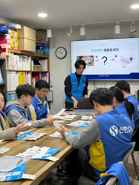 지.소.행이 수업 지도안 및 교육프로그램을 구성하고, 수수공예 협동조합이 재생종이 만들기 키트 제작 및 2차 공에 구성을 맡은 이번 프로그램은 우유팩 종이죽으로 직접 재생종이를 만든 후 도장, 압화 등의 과정을 거쳐 하나의 공예품을 만들어봄으로써 우유팩의 재생과정을 간접적으로 체험하고 그 재활용가치를 느껴보는 프로그램으로 매월 충무로에서 종이팩 수거 봉사에 참여하고 있는 신한DS 임직원의 참여로 시연이 진행됐습니다. 지.소.행은 이번 시연을 시작으로 해당 프로그램을 다양한 연령대가 참여할 수 있는 교육프로그램으로 개선시키고 발전시켜 나갈 계획입니다. 😎