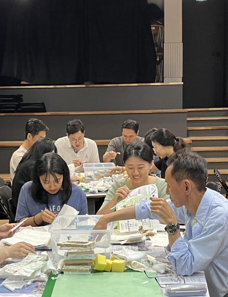 약속된 시간이 다 되었지만 종이팩 비닐을 뜯는 봉사자들은 이미 '몰입'의 상태로 접어든 듯 했습니다. 그만둘 기미가 전혀 보이지 않는 상태에서 마치 테이블 별로 경쟁이라도 하듯 하염없이 종이팩 비닐을 뜯는 사람들. 바로 지.소.행을 찾은 삼성카드 임직원 분들입니다. 😎