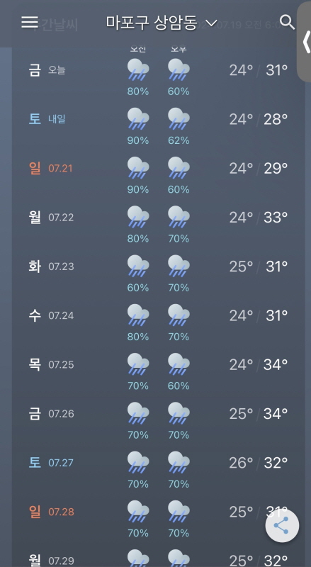 오늘도, 내일도, 모레도, 그리고 다음주도 계속해서 비가온다는 일기예보를 보신 적이 있으신가요? 조금은 낯선 이 일기예보는 지난주에 예보된 7월 4주차, 즉 이번주의 일기예보입니다. 이런정도로 끊이지 않고 비가 오는 날씨는 잘 본적이 없는 것 같은데 기후위기가 만드는 날씨의 변화가 차츰차츰 우리의 일상으로 스며드는 걸까요? ⛈️