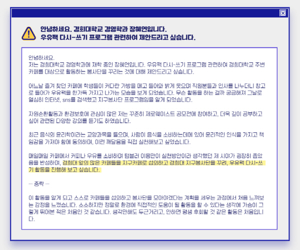 카페 섭외 목록까지 미리 작성해 올 정도로 우유팩 다시-쓰기 캠페인에 열정을 보인 장혜연님은 지.소.행 방문이후 묻지도 따지지도 않고 바로 팀을 꾸려 카페를 섭외한 후 본격적으로 활동에 돌입했습니다. 활동명은 '지구봉사단'과 경희대학교의 영문 약자인 'khu'를 적절히 섞어 만든 Zi-Khu방범대!(장혜연,황근영). 왠지 지쿠방범대가 경희대 인근의 대표 환경보완관이 될 것 같은 기분입니다. 😎