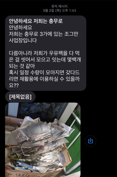 이메일에 이어 이번에는 문자를 통해 지.소.행의 문을 두드린 곳이 있으니, 그곳에서는 깨끗이 세척 후 곱게 자른 멸균팩이 잔뜩 쌓인 사진을 문자로 보내왔습니다. 1년 동안 우유팩을 모았다는 이곳의 정체는 지.소.행과 같이 충무로에서 일하고 있는 한 기업. (주)서스틴베스트입니다.