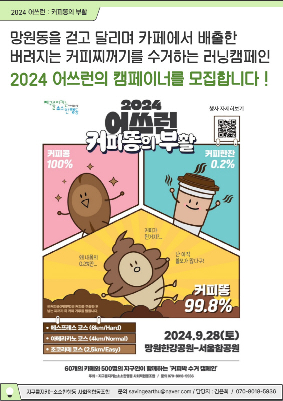 지구를지키는소소한행동이 야심차게 준비한 기후위기시민참여 캠페인 '2024-어쓰런:커피똥의 부활'이 D-2, 이틀 앞으로 다가왔습니다! 지소행은 이번 캠페인을 준비하기 위해 지난 8월부터 9월까지 두달 간 불철주야 다양한 활동 현장을 헤집고 다녔는데요! 그 노력의 결실이 9월 28일 토요일오전 10시망원한강 서울함공원에서 펼쳐질 예정입니다!