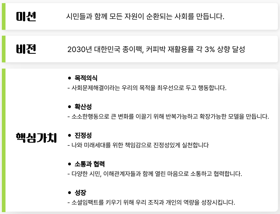 다가오는 25년도 사업 계획도 발표되었는데요. 워크숍을 통해 설정된 미션, 비전, 핵심 가치를 바탕으로 1) 제주 커피박 다시쓰기 캠페인 2) 정책, 제도전 개선 노력 3) 종이팩 분리배출 인식 개선 4) 환경 교육 및 우유팩 다시-쓰기 단체봉사 활성화, 4) 자원순환 사업 다각화 5) 커피박펠릿을 통한 기후 취약 계층 지원 등 다채로운 활동들이 계획되어 있습니다.