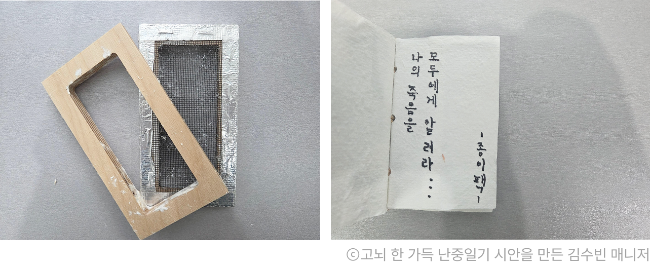 이어서 재생플라스틱 틀로 재생종이를 직접 떠보며 난중일기 모양의 수첩을 만드는 활동을 했어요. 그런데 아이들의 뜻밖의 반응이!😮