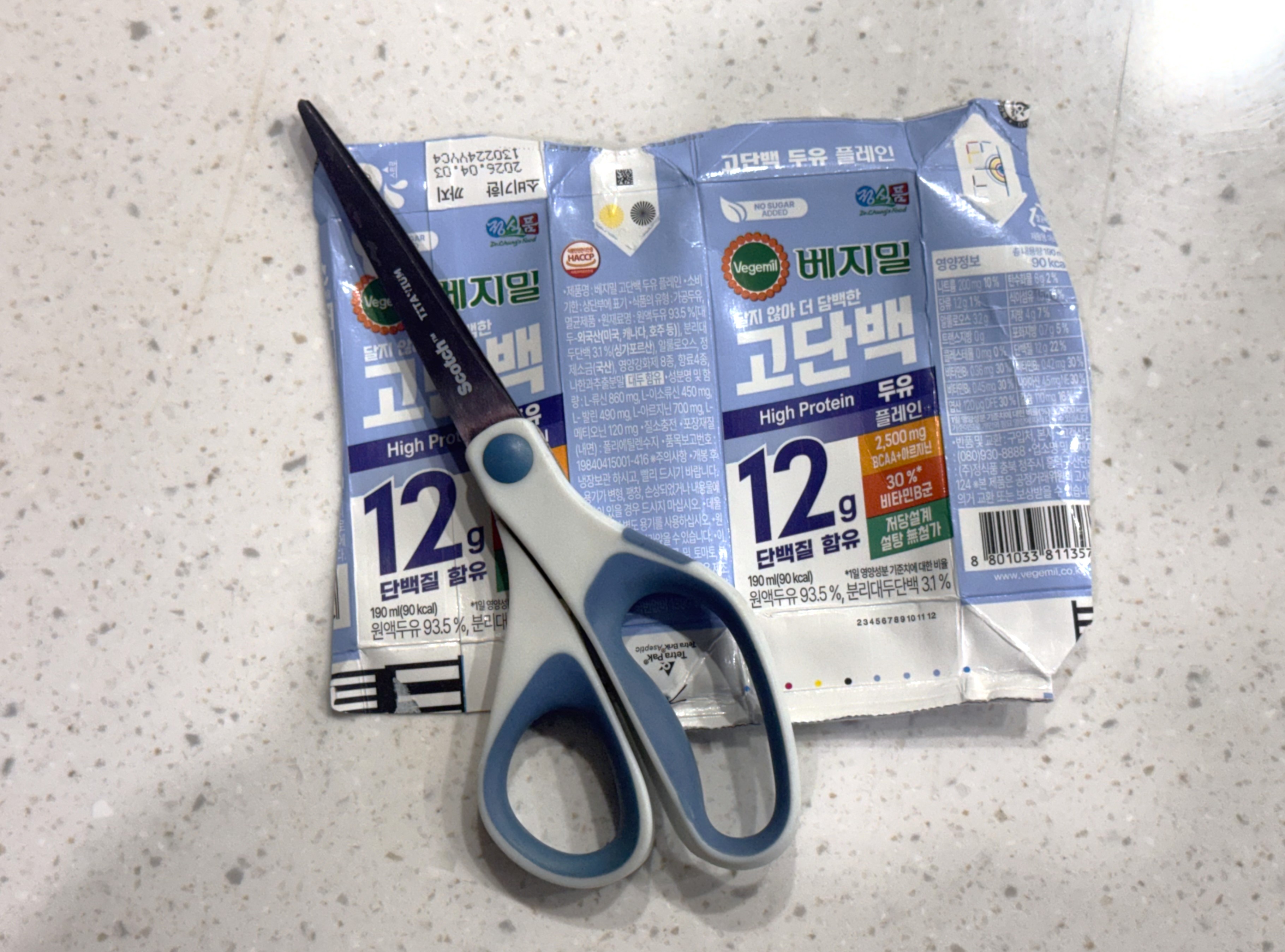 종이팩을 자를 때는 큰 가위를 사용하는 게 좋고, 칼로리가 작성되어 있는 부분을 오른쪽에 두고 자르면 잘 잘려요.