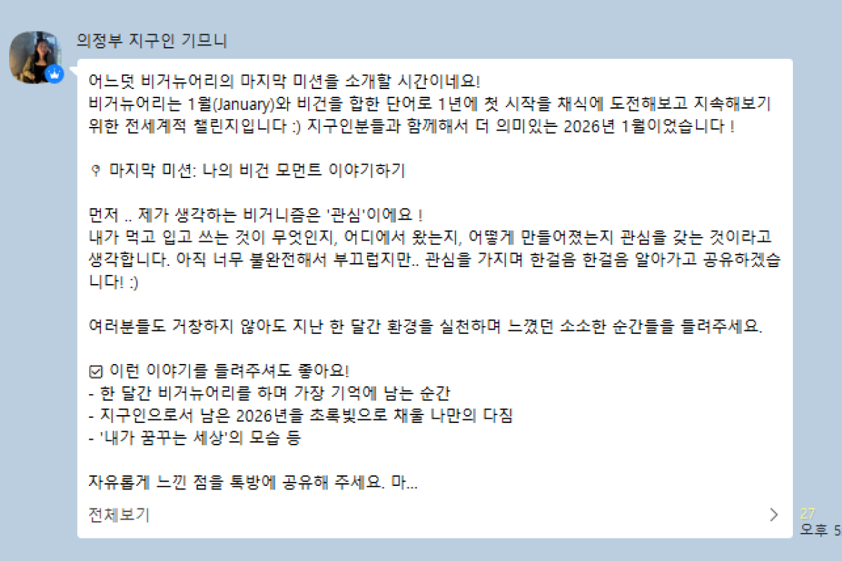 지난 1월동안 지구인 단톡방에서 비거뉴어리 미션을 진행했어요. 비거뉴어리(Veganuary)는 비건(Vegan)+1월(January)를 합친 용어로, 1월 한 달 동안 비건을 실천하는 국제 캠페인이에요. 매주 다른 미션을 통해 "기후위기 시대에, 어떻게 하면 다 같이 잘 지낼 수 있을까?"를 함께 고민했던 시간이었어요. 한 달 동안 참여해 준 지구인 여러분 고맙습니다😍 공식적인 미션은 끝났지만, 각자 자신만의 속도로 환경을 위한 실천을 이어가길 바라요. 지소행이 뒤에서 늘 함께 하고 있어요! |