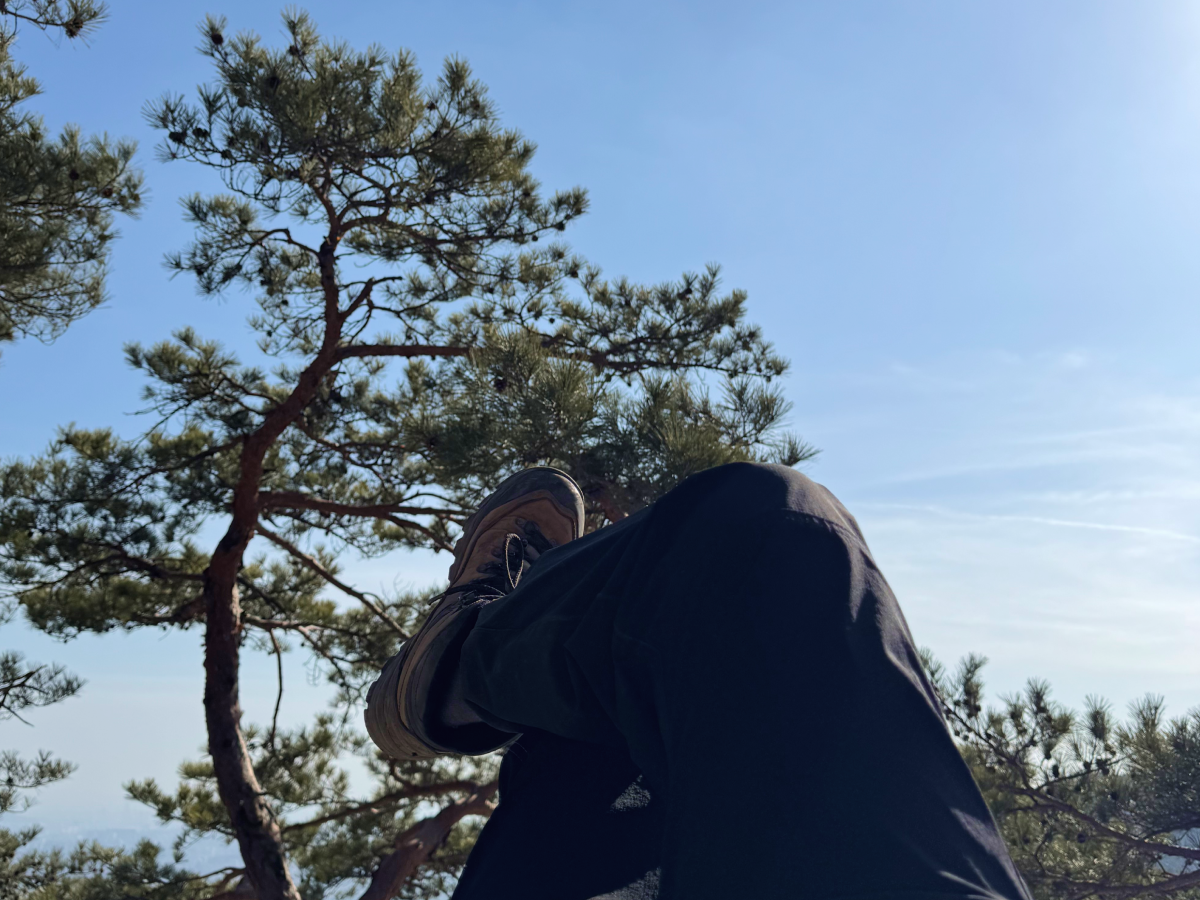 '빨리 내려야겠다'는 생각 뿐이었던 저에게 쉬고 가자니. 하지만 말은 잘 듣는 편이라 따라 누웠어요. 그러자 이제서야 푸른 하늘과 소나무가 보이고, 바람이 느껴졌어요. 느린 삶을 살고 싶다고 말했던 제가 취미조차 빨리 끝내려고 하다니, 조금 부끄러워졌어요.